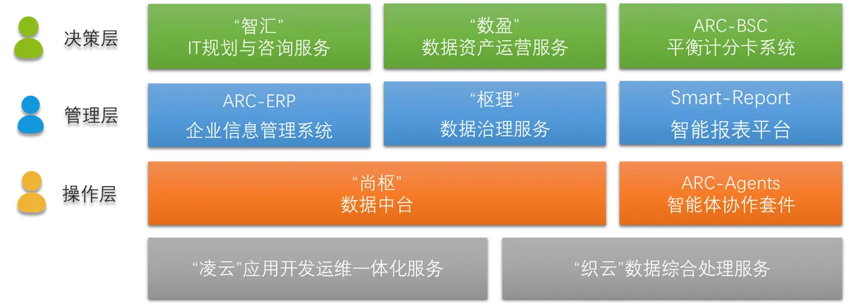 決策層,“智匯”IT規(guī)劃與咨詢服務(wù),憑借專業(yè)團(tuán)隊對行業(yè)趨勢和技術(shù)生態(tài)的深度洞察,為企業(yè)量身定制契合發(fā)展戰(zhàn)略的IT架構(gòu)藍(lán)圖,明晰數(shù)字化路徑;“數(shù)盈”數(shù)據(jù)資產(chǎn)運營服務(wù),挖掘企業(yè)數(shù)據(jù)價值,將分散數(shù)據(jù)轉(zhuǎn)化為可運營、能創(chuàng)造效益的資產(chǎn),驅(qū)動業(yè)務(wù)創(chuàng)新;ARC - BSC平衡計分卡系統(tǒng),以戰(zhàn)略為導(dǎo)向,從財務(wù)、客戶、內(nèi)部流程、學(xué)習(xí)與成長等維度,量化指標(biāo)、監(jiān)控進(jìn)度,助力科學(xué)決策 。