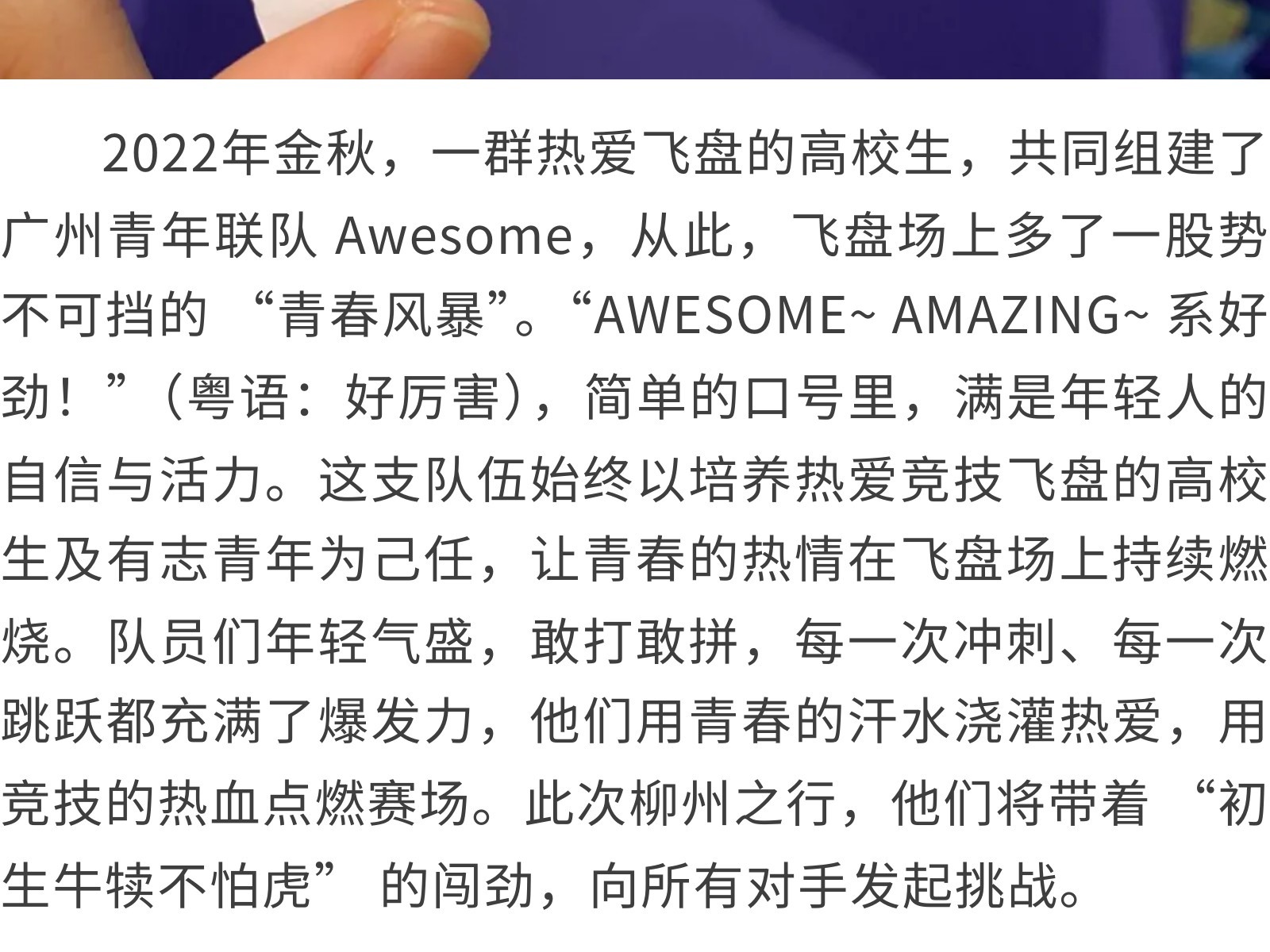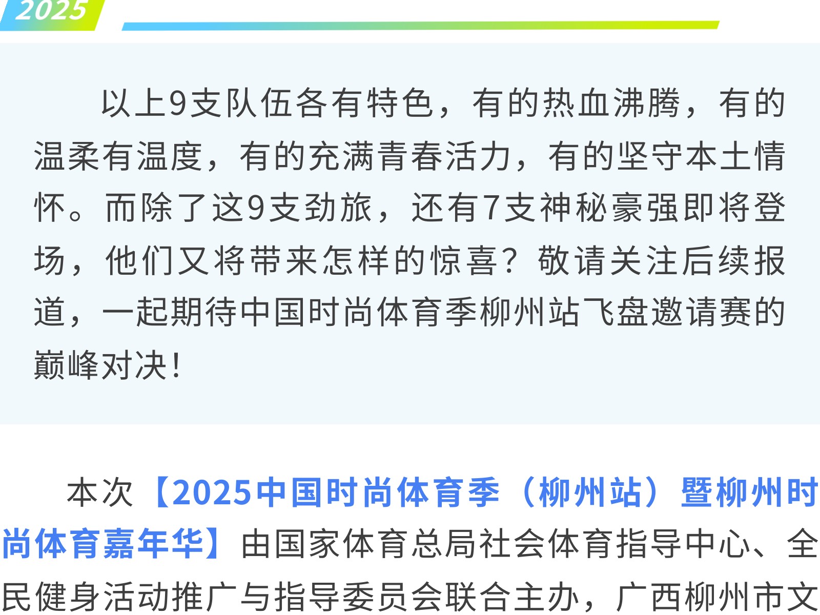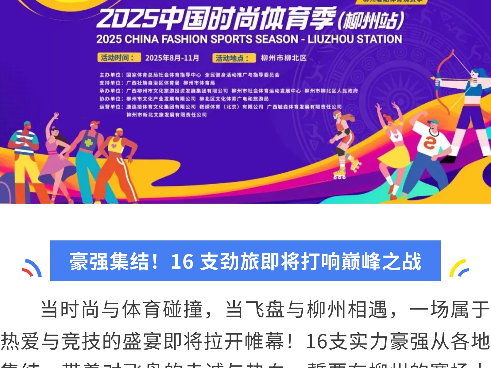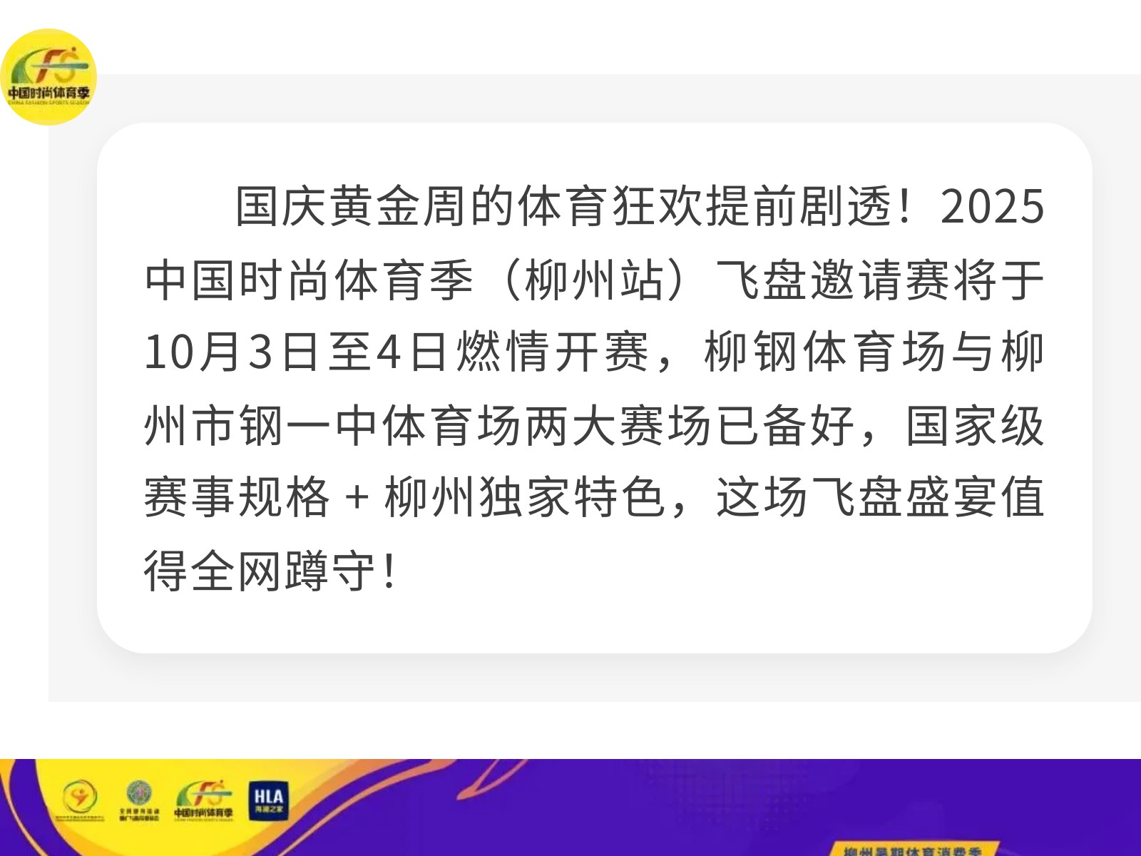 燃動(dòng)柳州!中國時(shí)尚體育季飛盤(pán)邀請賽16豪強集結,九支勁旅先睹為快 發(fā)布時(shí)間:2025年09月30日 16時(shí)來(lái)源:本站原創(chuàng )瀏覽:25 人次