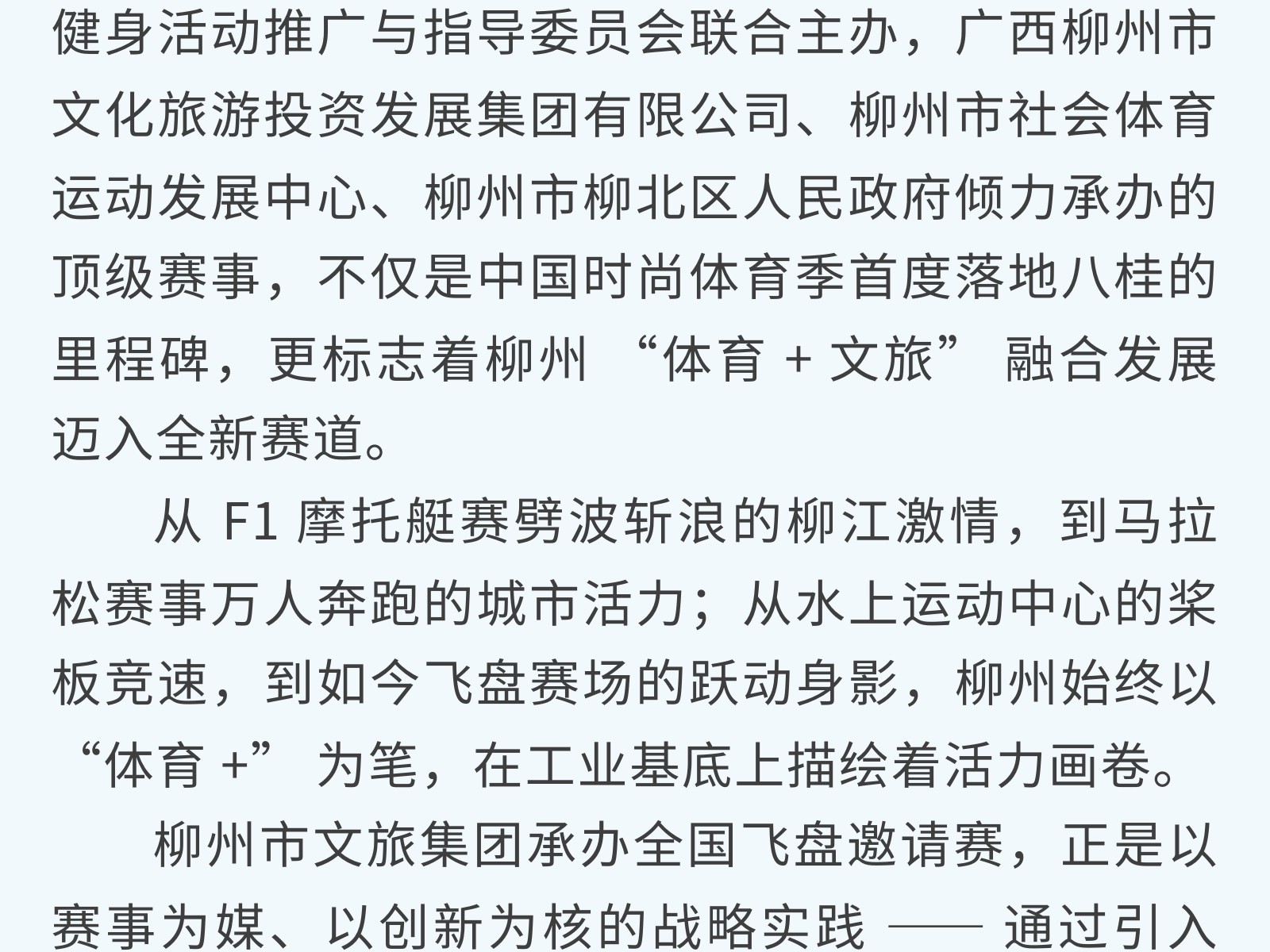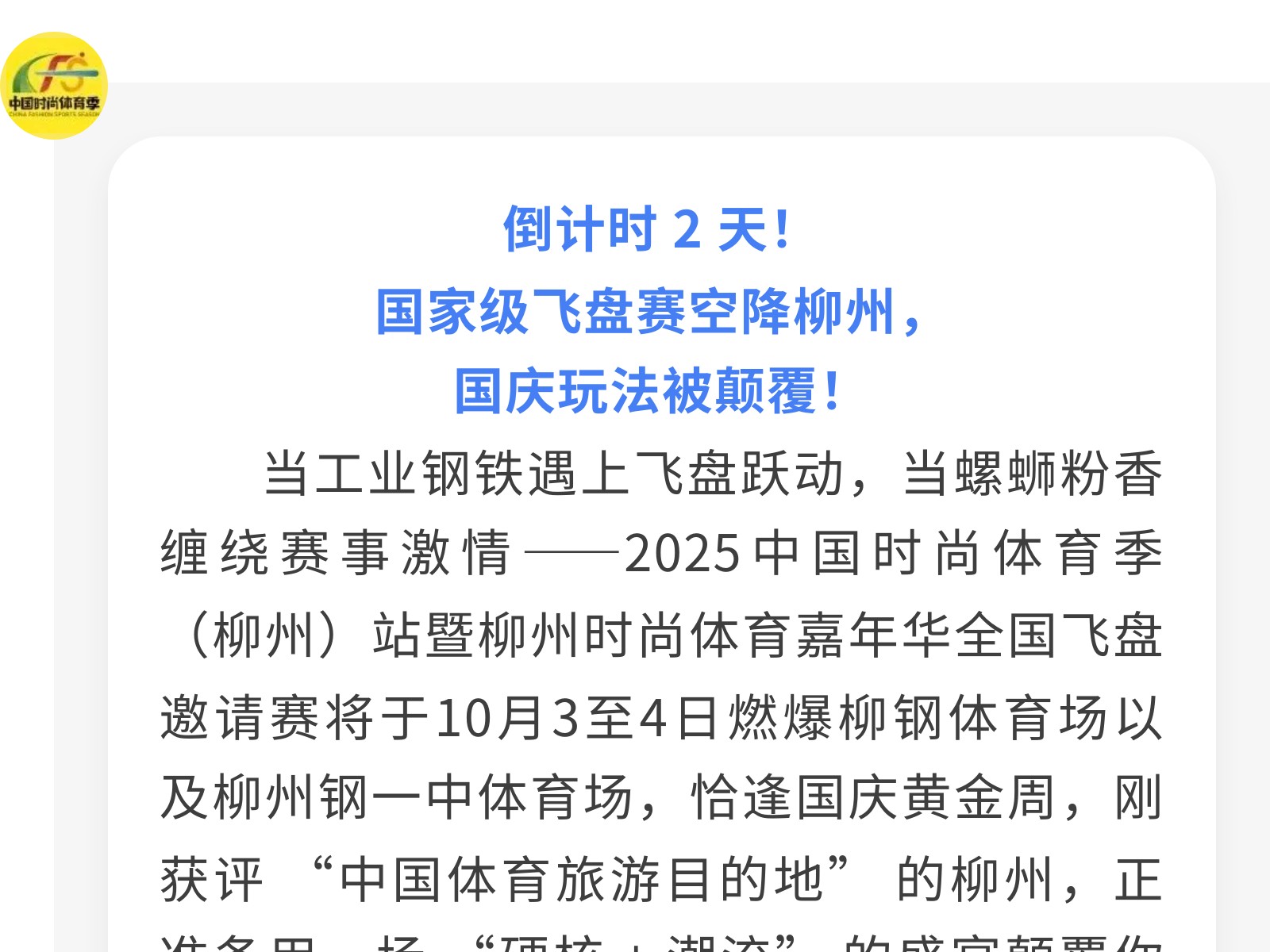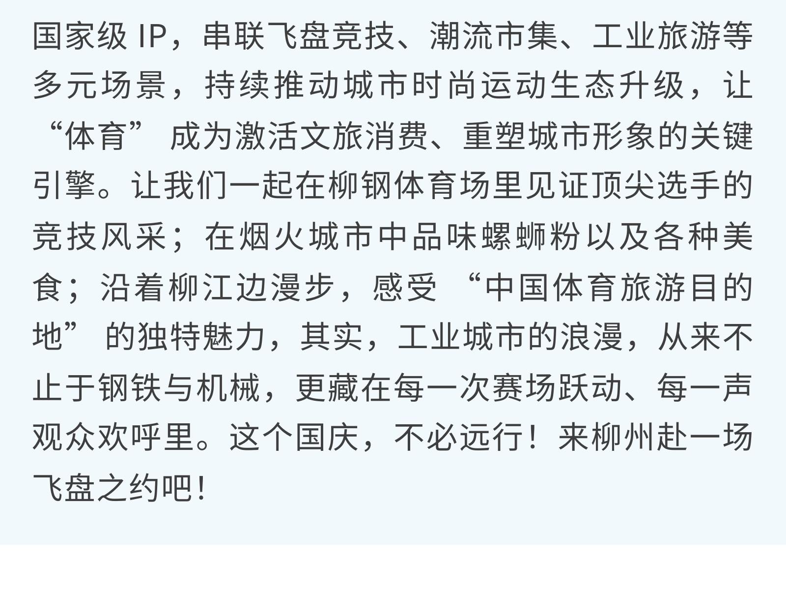 國慶赴柳!鋼鐵賽場(chǎng)飛盤(pán)燃,柳州這座體育旅游之城藏不住了 發(fā)布時(shí)間:2025年10月02日 17時(shí)來(lái)源:本站原創(chuàng )瀏覽:29 人次
