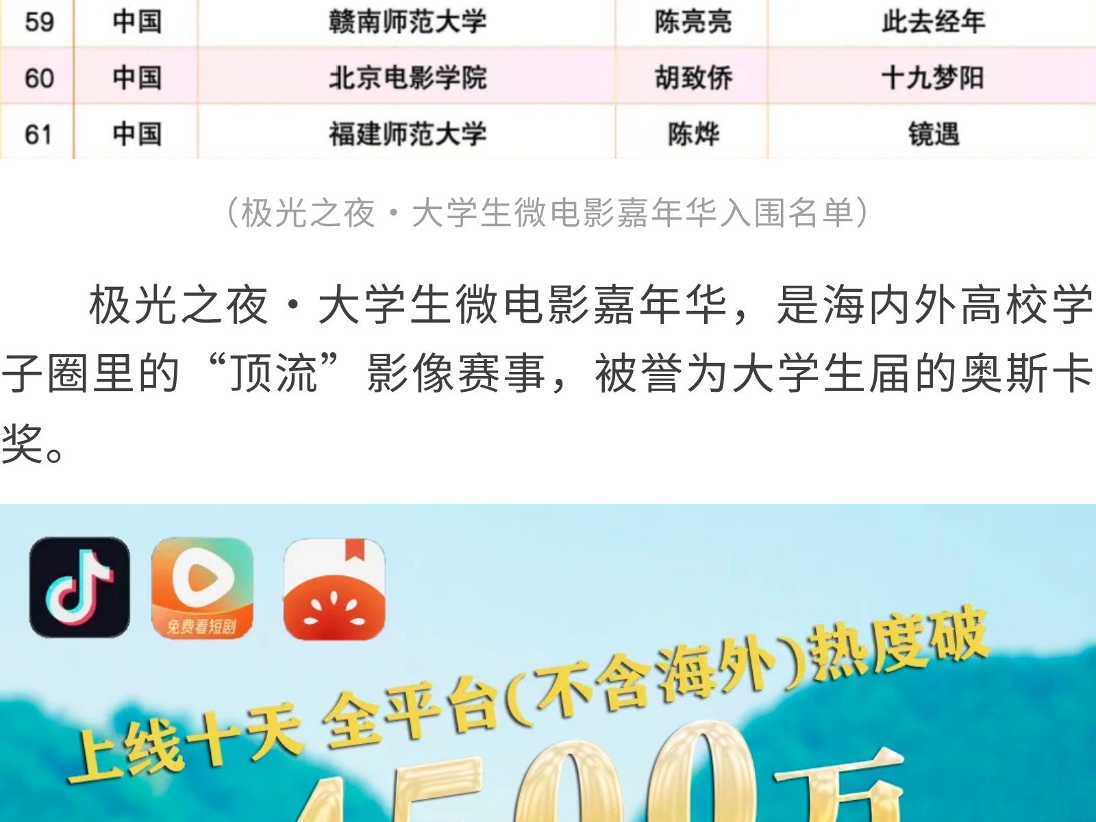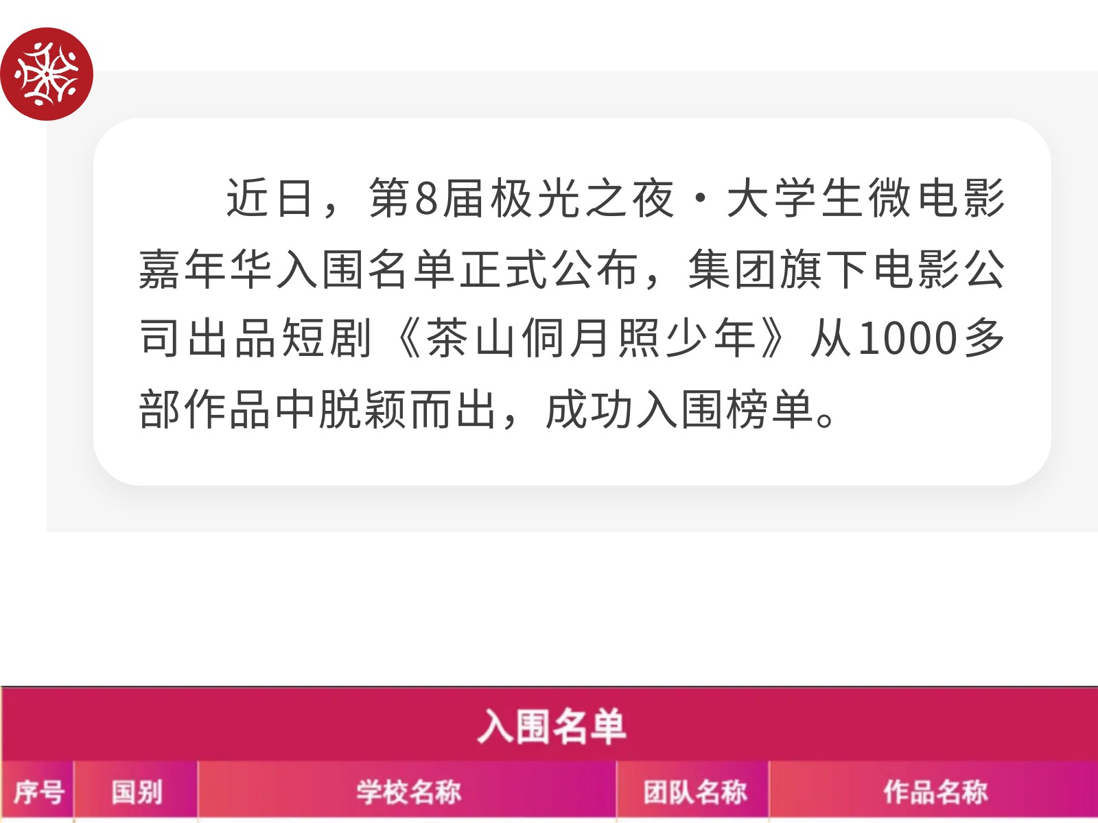 喜報(bào)!集團(tuán)旗下電影公司出品短劇《茶山侗月照少年》入圍第8屆極光之夜·大學(xué)生微電影嘉年華 發(fā)布時(shí)間:2025年10月14日 15時(shí)來(lái)源:本站原創(chuàng)瀏覽:162 人次