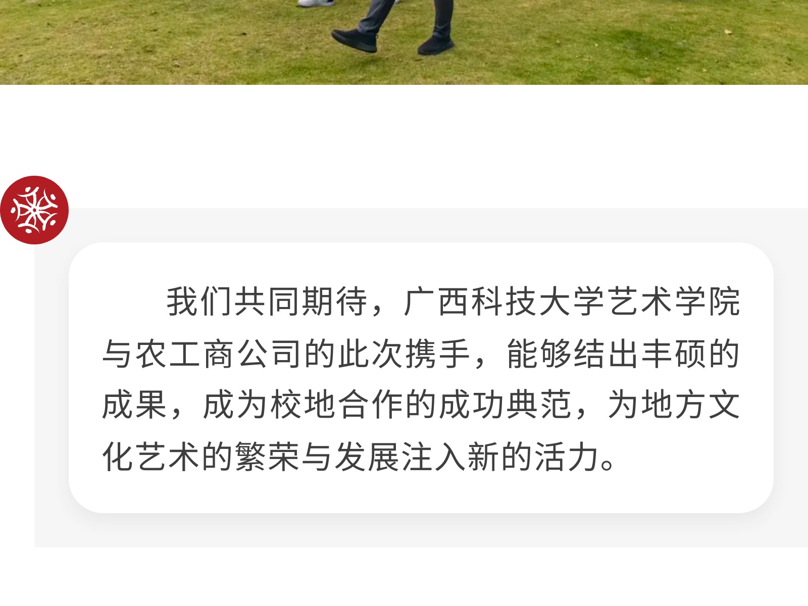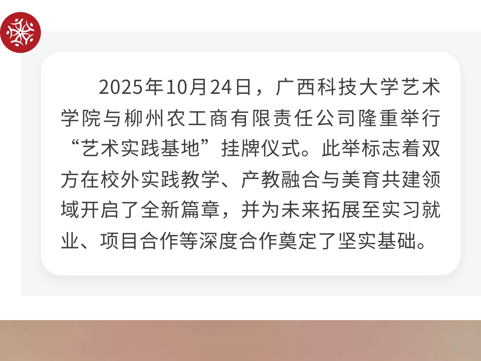 【校企攜手 共育英才】廣西科技大學(xué)藝術(shù)學(xué)院與柳州農(nóng)工商公司正式簽署校企合作協(xié)議 發(fā)布時間:2025年11月02日 10時來源:本站原創(chuàng)瀏覽:108 人次