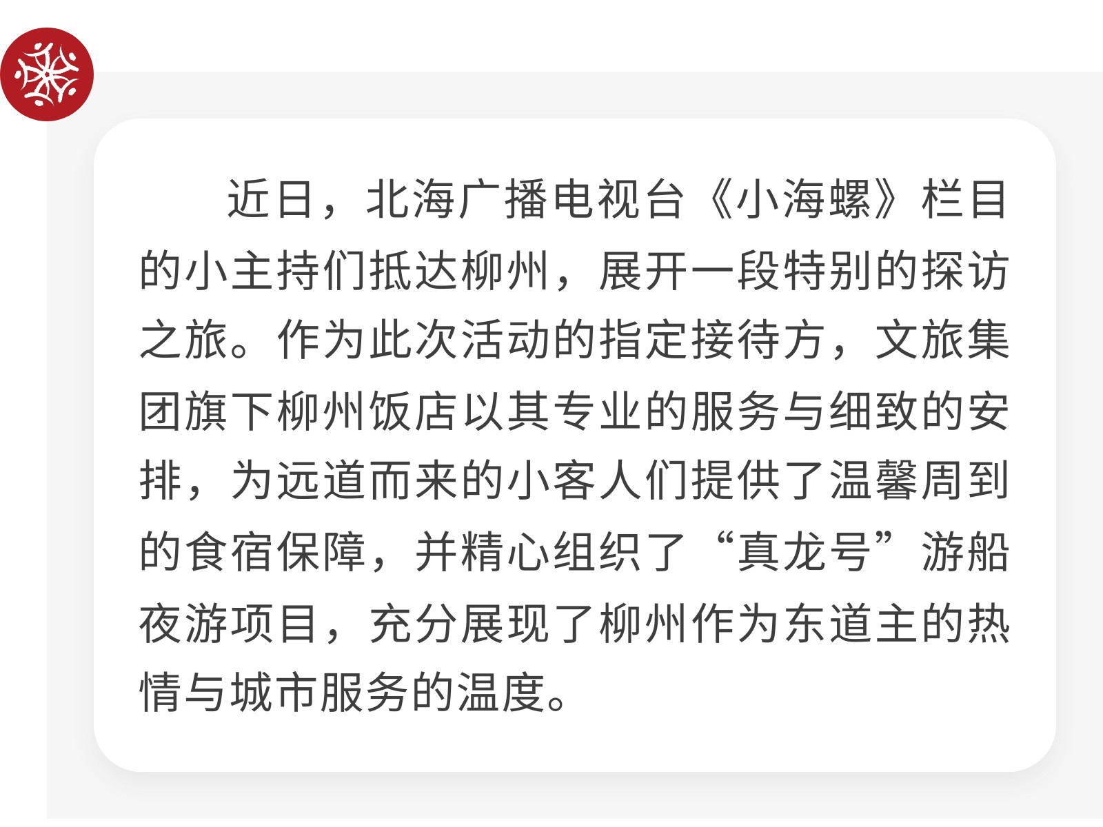 柳州飯店暖心接待北海“小海螺”,乘“真龍?zhí)枴惫操p柳江夜景暢談雙城情誼 發(fā)布時間:2025年11月07日 10時來源:本站原創(chuàng)瀏覽:109 人次