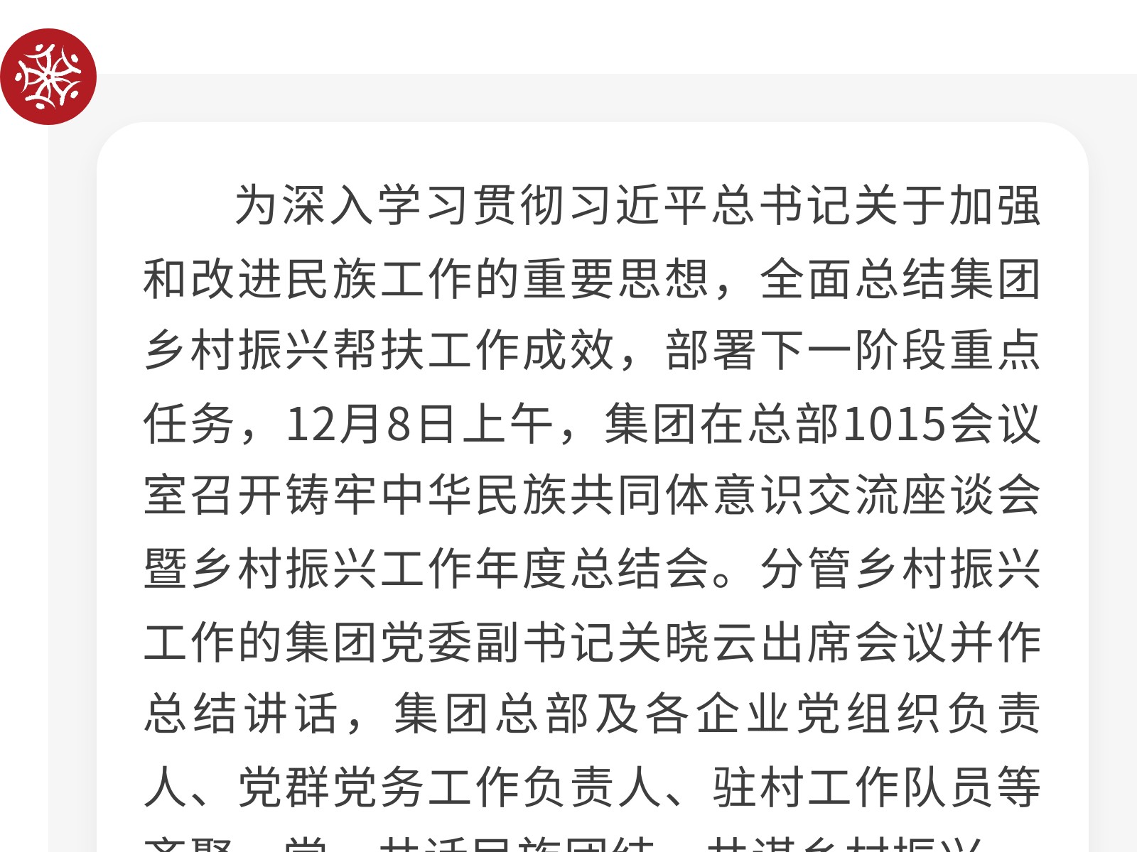 【凝心聚力共奮進 民族團結(jié)譜新篇】集團召開鑄牢中華民族共同體意識交流座談會暨鄉(xiāng)村振興工作年度總結(jié)會 發(fā)布時間:2025年12月08日 10時來源:本站原創(chuàng)瀏覽:34 人次