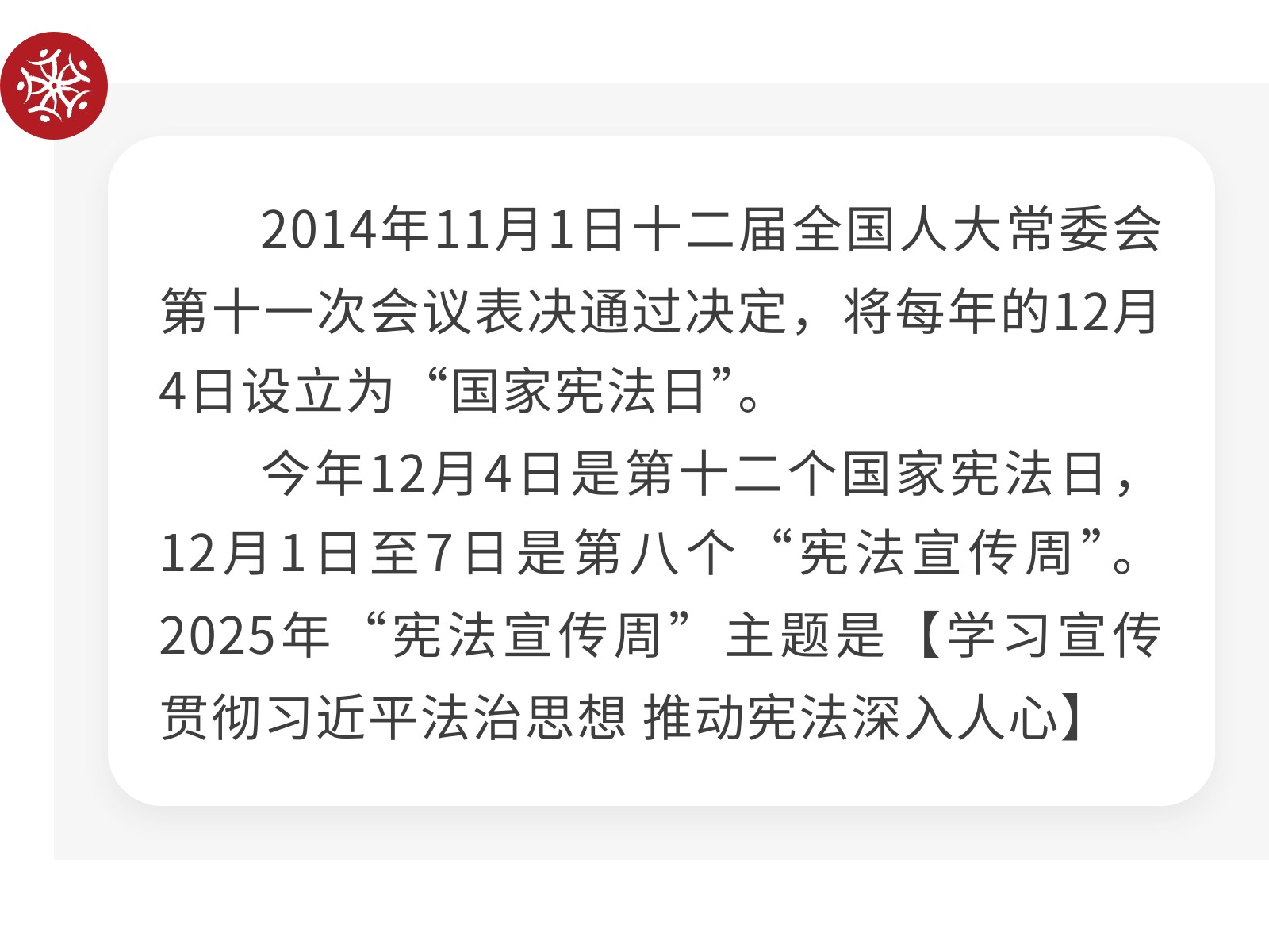 【憲法宣傳周】弘揚憲法精神,守護法治根基。 發(fā)布時間:2025年12月08日 10時來源:本站原創(chuàng)瀏覽:33 人次