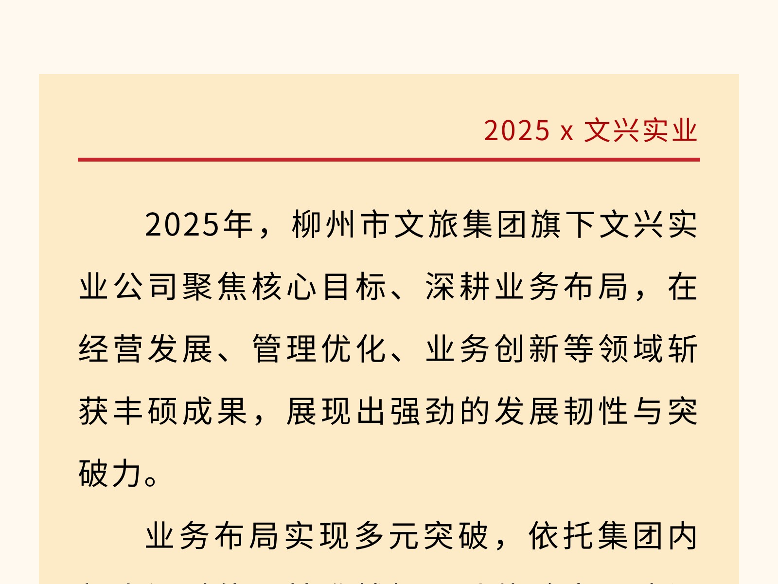 【文旅聚勢2025】多元創(chuàng)新拓新局,實干賦能高質(zhì)量發(fā)展——文興實業(yè)激活發(fā)展新動能 發(fā)布時間:2025年12月24日 10時來源:本站原創(chuàng)瀏覽:51 人次