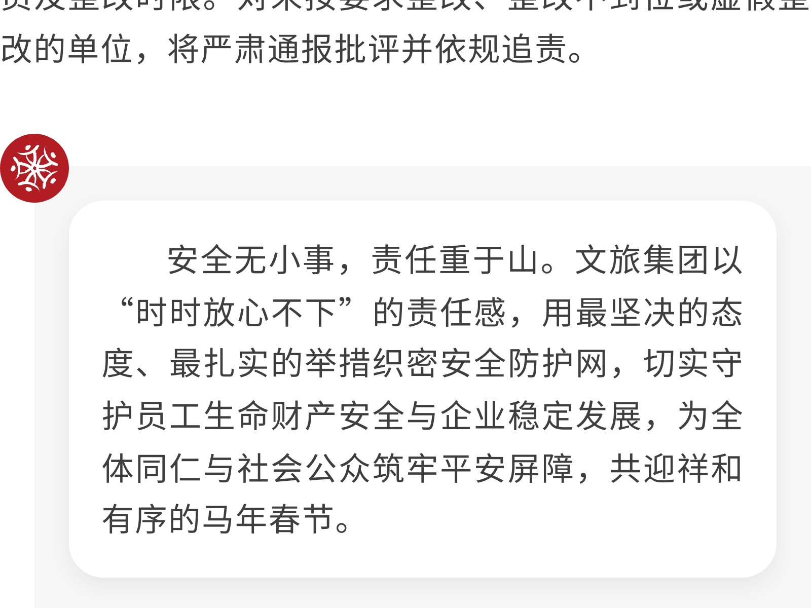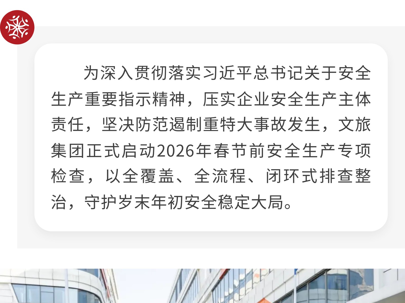 筑牢安全防線 護(hù)航馬年新春——文旅集團(tuán)啟動2026年春節(jié)前安全生產(chǎn)專項檢查 發(fā)布時間:2026年02月03日 15時來源:本站原創(chuàng)瀏覽:41 人次