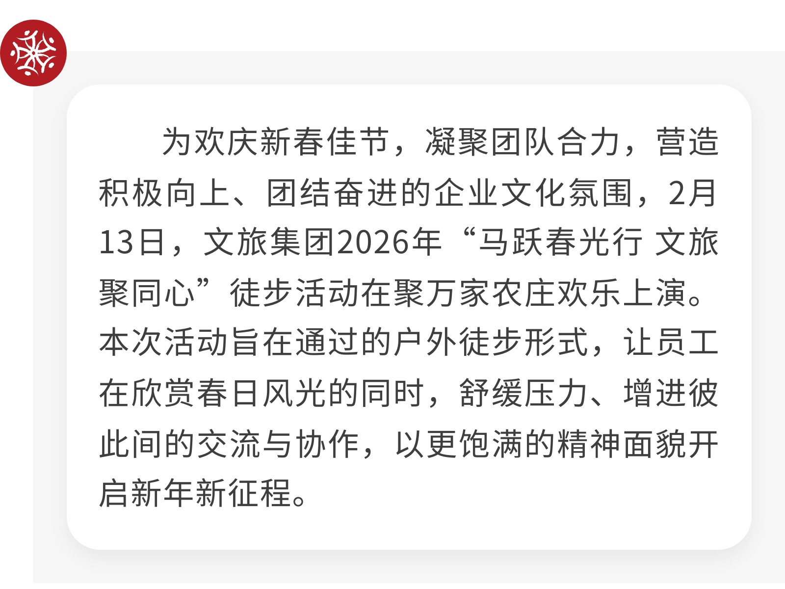 “馬躍春光行 文旅聚同心”——文旅集團徒步活動圓滿落幕 發(fā)布時間:2026年02月16日 13時來源:本站原創(chuàng)瀏覽:10 人次